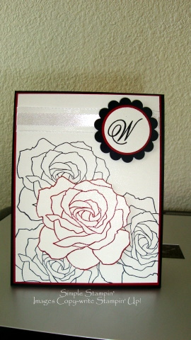The card base is Basic Black with a layer of Cherry Cobbler. On the top layer of Shimmery White card stock I stamped 3 roses from the set "Fifth Avenue Floral" in Jet Black StazOn. I wrapped a strip of 5/8" organza ribbon around the top & used some sticky strip to adhere the ends to the back of the shimmery white card stock. I punched out a 1 3/4" scallop circle from black card stock & layered a 1 3/8" Cherry Cobbler circle on top of that. I embossed the "W" from the set "Monogram Sweet Alphabet" using Versa Mark & black embossing powder on Shimmery White card stock. I then punched it out using the 1 1/4" circle punch & layering the punches using sticky strip. The entire scallop circle is on a dimensional on the ribbon. For a bit of a contrast I stamped the rose on a separate piece of Shimmery White card stock using the Cherry Cobbler Craft ink spot & clear embossing powder. I then cut it out & popped up on the black roses with dimensionals.